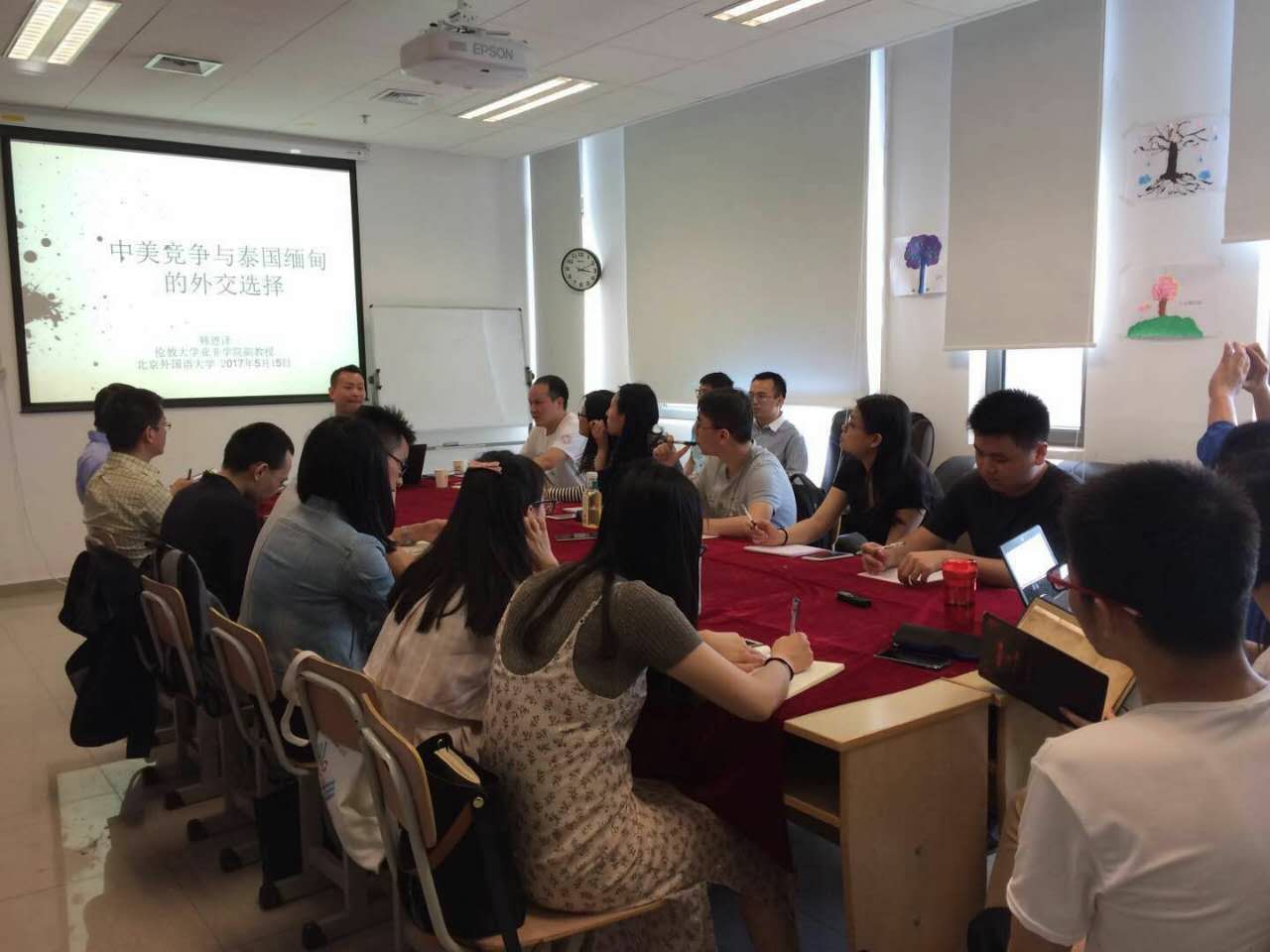 2017年5月15日下午3点至5点,北外国关学院在西院综合楼1151会议室举办了北外国关前沿沙龙第十六期活动,活动主题为“中美竞争与泰国、缅甸的外交选择”。本次活动邀请的嘉宾为伦敦大学亚非学院(SOAS,University of London)政治和国际关系学系副教授韩恩泽,尹继武教授主持,张效民副教授和史泽华副教授分别担任评议人,来自PA视讯集团网站和其他高校及研究机构的众多学者和同学也参与了讨论。