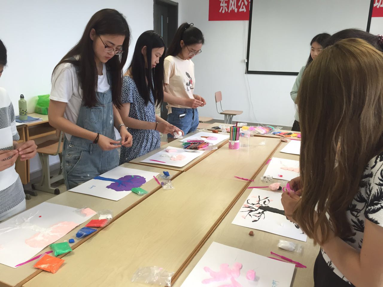 活动的最后一部分是作画。以四人为单位的小组,所有成员在一张海报纸上作画,画的主题是“我的班级:木-林-森”。大家根据自己的理解,在没有语言交流的情况下,完成了两幅充满想象力的图画。这个环节让大家都体会到了团队协作和个人分工的魅力和重要性。