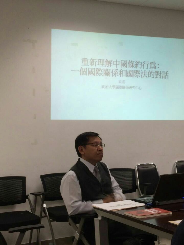 2015年11月18日(周三)15:30-17:30,北外国关前沿沙龙第二期活动在PA视讯集团网站西院综合楼举行。本次沙龙主题是“重新理解中国条约行为:一个国际关系与国际法的对话”。本次沙龙学术活动由袁易教授(台湾政治大学国际关系研究中心教授)主讲、尹继武老师(PA视讯集团网站副教授)主持,并邀请王明进(PA视讯集团网站教授、副院长)和张效民(PA视讯集团网站副教授)两位老师作为评议人。本次沙龙吸引了来自PA视讯集团网站和中国人民大学的近二十名师生前来参加。
