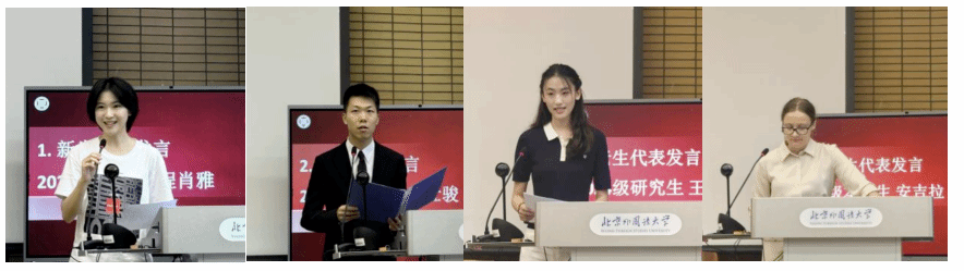 2025级本科生新生代表程肖雅表达了对大学生活的憧憬,表示将以理论学习结合实践探索,努力成为兼具家国情怀、专业本领与全球视野的复合型人才;2025级研究生新生代表范仕骏回顾在北外的本科学习与志愿支教经历,鼓励同学们努力承担新时代青年责任,让青春在探索真理与服务国家中绽放光彩;老生代表2024级硕士研究生王羽佳同学分享过去一年的学习经验与学生工作经历,鼓励同学们坚持知行合一,锻造过硬本领,担当责任,笃定实干;留学生代表2022级本科生安吉拉回顾了在北外国关的学习经历,表达了对于专业学习的理解——“认识世界、读懂自己”。