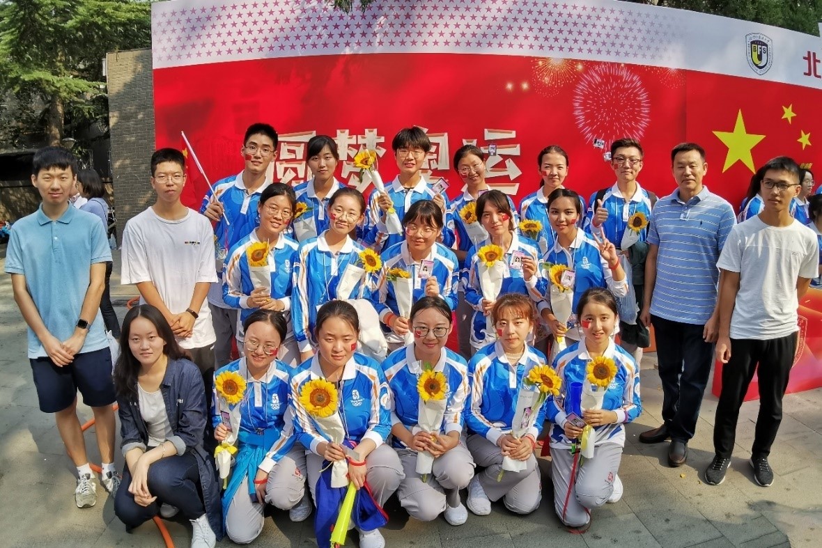 10月1日下午2时,参加国庆庆祝活动的学生返回学校,PA视讯集团网站党总支书记张效民及学生代表到文化广场迎接,祝贺他们圆满完成任务并表示慰问。