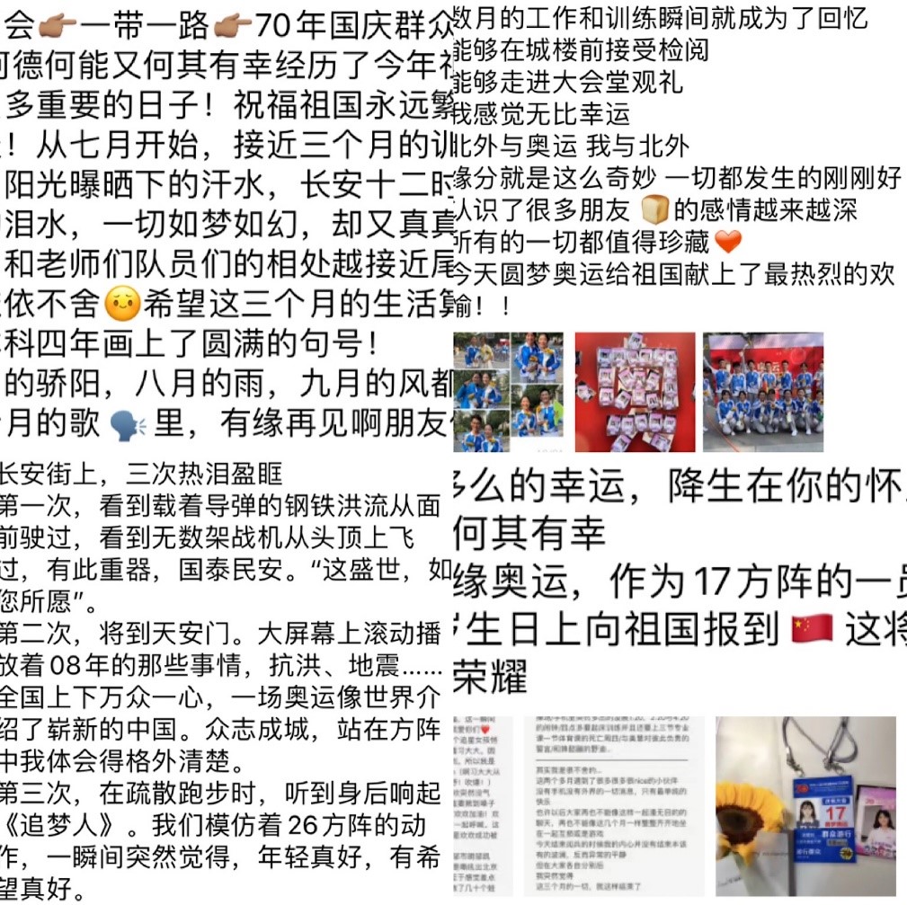 有机会参与国庆群众游行这一盛事,同学们感到十分激动。2018级本科生何苏菲表示,这一次经历值得铭记一生,当看到拉着彩雾的飞行梯队划过长空,国之重器东风导弹在眼前驶过,英雄后代向自己挥手,自己发自内心地为祖国感到骄傲、自豪,永远不会忘记这次参与群众游行活动的经历。其他参演同学也纷纷在自己的微信朋友圈抒发了对祖国的热爱。