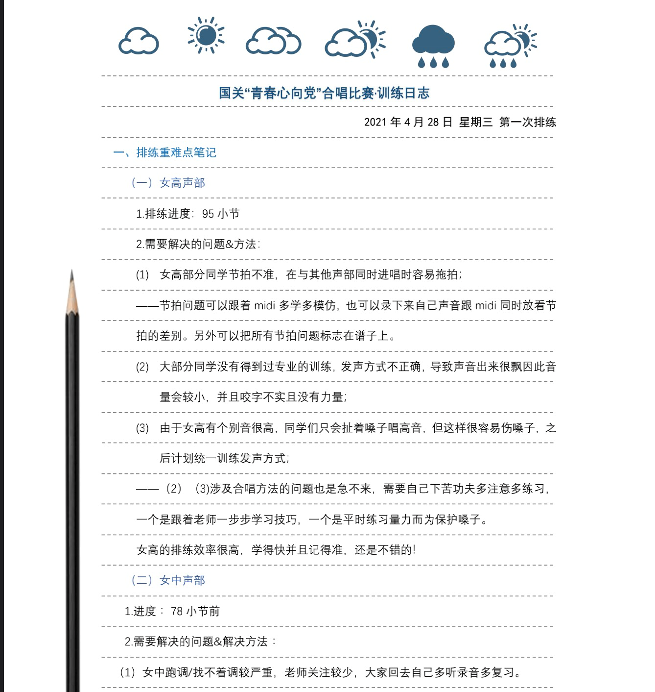 各声部长精心制作的训练日志,帮助同学们提升合唱技巧)
