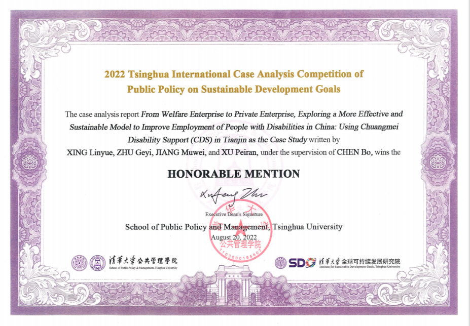 我院学生聚焦从福利企业到私营企业,探索更加有效和可持续的模式促进残疾人就业:以创美模式为例From welfare enterprise to private enterprise, exploring a more effective and sustainable model to improve employment of people with disabilities in China: using Chuangmei Disability Support (CDS) in Tianjin as the case study),通过探访天津创美助残基地,了解我国目前最新的推动残疾人就业模式,在陈波老师的指导下,从残疾人就业现状、就业政策变迁调整、企业助残困境、创美助残模式等角度进行案例研究,并提供建议。