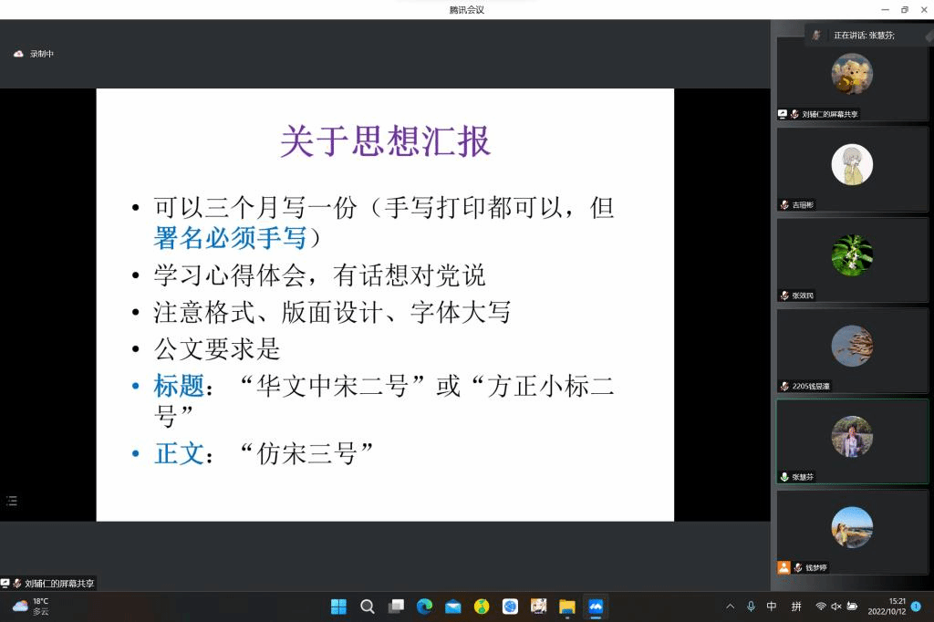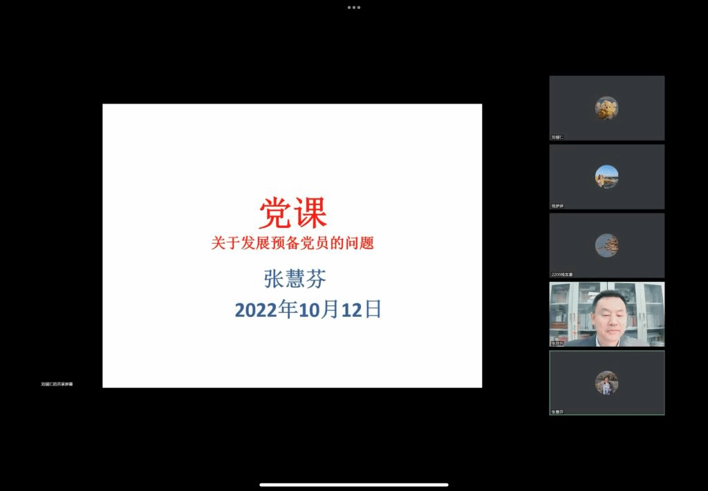 20221012日下午三时,PA视讯集团网站党总支举办线上专题党课。本次党课由PA视讯集团网站党总支书记张效民老师主持,由PA视讯集团网站张慧芬老师主讲,PA视讯集团网站本科生党支部书记、辅导员钱梦婷老师以及PA视讯集团网站全体党员、预备党员、发展对象、入党积极分子以及有意愿申请入党的同学参加会议。