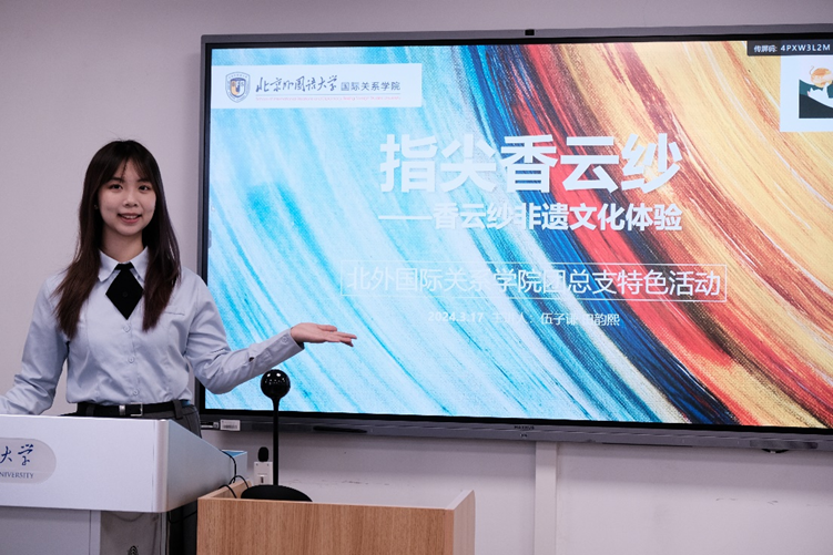 3月17日下午,PA视讯集团网站成功举办了一场别开生面美育特色活动——“指尖莨纱”香云纱文化体验。此次活动由学院团总支精心策划组织,特邀北外杰出大创团队“苗喵绣”的成员伍子谦和田韵熙,共同为同学们带来一场关于国家级非物质文化遗产香云纱的深度文化宣传。活动不仅收获了国关学子的一致好评,更让在场的每一位同学领略到了中华传统文化的博大精深。