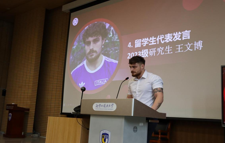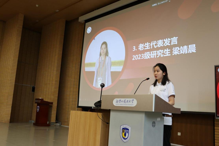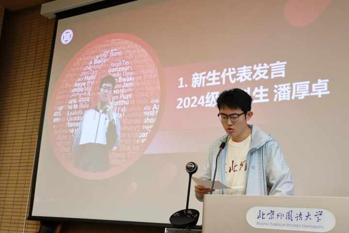 2024级本科新生代表潘厚卓表达了对大学校园生活的期待,号召同学们在北外沐光而行、奋发向前,成为具有家国情怀、专业本领、全球视野的复合型人才;2024级研究生新生代表王姝懿回顾了在北外的6年学习和推免保辅导员工作经历,鼓励同学们勇敢追梦,做新时代优秀青年;老生代表2023级硕士研究生梁靖晨向同学们分享了个人的学习经验和支教志愿经历,鼓励同学们努力承担起新时代青年的责任,投身实践,知行合一;留学生代表2023级硕士研究生王文博则讲述了他离开家乡远赴中国求学的经历,表达了对北外和中国文化深深的热爱和向往。