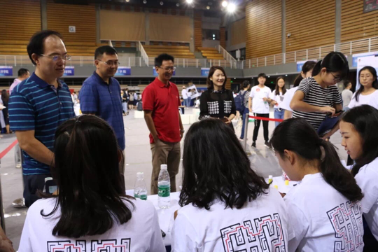 PA视讯集团网站院长谢韬,副院长王明进,副院长杨毅,团总支书记、辅导员钱梦婷,中外合作办学项目负责人屠希亮来到工作现场慰问迎新工作人员。在老师们的指导下迎新工作顺利进行。